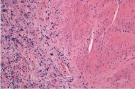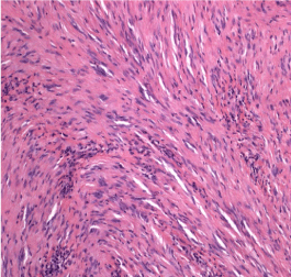 Final histologic sections of the excised esophageal mass show a submucosal proliferation of spindle cells with elongated nuclei with bland nuclear features (Figure 2 and 3). There are numerous admixed reactive lymphoid follicles. Focally, there is a suggestion of Verocay body formation (Figure 4). Antoni A and B tissue types are also visible in these sections. Immunohistochemical stains demonstrate that these spindle cells stain with S100 (Figure 5) and SOX-10. Stains for CD34, CD117, Actin, AE1/ AE3, Desmin, and DOG-1 are negative within the spindle cells.The negative reactivity for CD34 and CD117 rules out a gastrointestinal stromal tumor (GIST) and negativity for Actin and Desmin stains distinguishes the tumor from the more common leiomyoma. A stain for STAT6 is negative and a stain for neurofilament does not highlight axon within the lesion. Overall these findings are diagnostic for Schwannoma. There are no features to suggest malignancy.