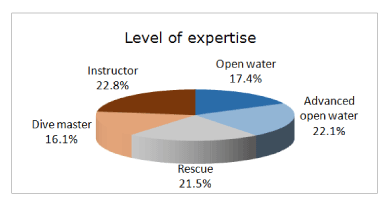 The expertise in diving among the subjects was diverse: 22.8% were instructors and 16.1% were dive masters. Both levels are professional. At the recreational level, 22.1% were advanced open water divers, 21.5% were rescue divers, and 17.4% were open water divers (Figure 1)