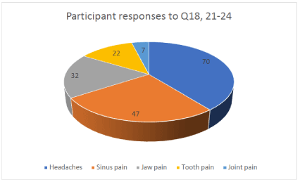 Questions 21-24 requested the divers to indicate whether they had any pain during and/or after the dive in: 1) in the teeth, 2) the jaw, 3) the sinus, 4) head pain [headaches] and 5) joint pain (elbows and knees). The results indicated that the divers experienced tooth pain 16.2% (n=22) as previously indicated above, jaw pain 22.1% (n = 32); sinus pain 32.2% (n = 47); headache(s) during or after diving 49% (n = 70); joint pain4.7% (n = 7). Only two responses described the pain as a deep pain in the knee (Figure 4).