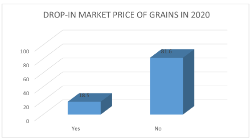 In (Figure 3) farmers were asked if they had experienced a drop in the market price of cowpea and sorghum grains in comparison to the previous year. Majority (82%) of the farmers reported not to have experienced a fall in price within the two years. Therefore, on the contrary, the price of the above crops increased in 2020, that is, during the lockdown. According to Daedal Research (2020), the global seed market has observed consistent growth in the past few years and is anticipated that the market would witness moderate growth over the forecasted period (2020-2024) owing to spread of pandemic disease COVID-19. Moreover, the market would observe moderate growth owing to various growth augmenting factors such as budding global population, escalating organic farming, increasing agricultural production, spike in demand for plant-based proteins, surging demand for biofuel and upsurge in government initiatives (Daedal Research, 2020).