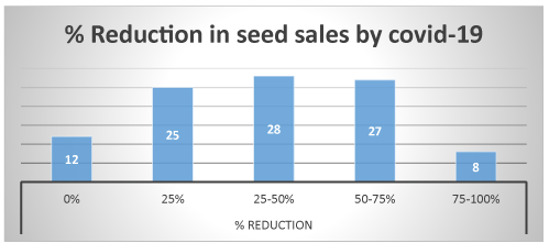 (Figure 4) shows the percentage reduction of seeds sold during the covid-19. 12% of the seed company reported that their seed sales were not affected by the pandemic, 25% of them reported that they experienced 25% reduction in their seed sales. 28% experienced 20- 50% reduction in their seed sold. 27% of the seed company experienced 50-75% reduction in the number of seed sold during the covid-19. And lastly, 8% of the seed company experienced 75-100% reduction in the sales of seed during the covid-19. Under the COVID-19 scenarios, agricultural commodity prices are projected to drop by more than 10% below baseline level in 2020-21 which in turn would affect seed sales. This projected decline is more pronounced than that witnessed during the first half of 2020 partly because the model assumes that the effect is evenly distributed across the year and not monthly or staged by countries (OECD, 2020)