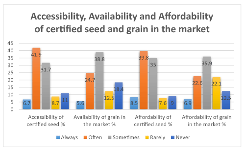 (Figure 5) shows accessibility and affordability of certified seed during the covid-19 pandemic. The highest percentage of the farmers reported that certified seed was often accessible during the lockdown and they were often affordable too. Some other 31-35% noted that they were sometimes accessible and affordable. Thus, the availability and affordability of certified seed and grain in the market was rarely affected by the covid-19 pandemic. Access to genuinely certified seed continues to be a challenge for smallholder farmers in Nigeria. Farmers, especially those in rural areas are underserved with respect to functional agro-dealers because they tend to concentrate in cities that are far away from farmers (AGRA, 2017).